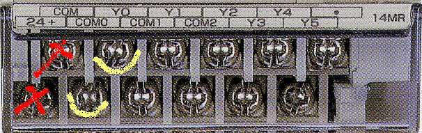 是我沒有說清楚 ,圖中的紅叉不算。那兩個黃色標記的是輸出端的COM0,另一個是Y0。如果要用這兩個端子控制一電磁繼電器你會怎么接線?