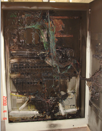 我覺得問題的根本還是在這里,從你的圖和上圖可以看出,你的總斷路器應該裝在上圖控制柜的左上部,總斷路器進線必須經過分線銅排旁邊的線槽和許多控制線混在一起接到總斷路器。在總斷路器出端嚴重短路的情況下總斷路調閘,可是險情并沒有根除,由于線路短路產生的巨大熱量同樣會使總斷路器的進線絕緣損壞形成二次嚴重短路。所以會出現你的總斷路器已經斷開的事實。你的控制柜分線銅排位置的嚴重燒焦,仔細看也剛好在你的控制柜進出線線槽口附近最為嚴重。