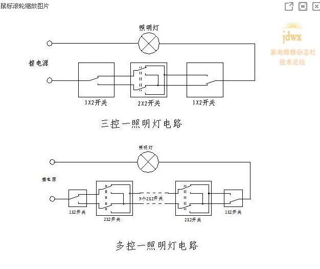兩個(gè)開(kāi)關(guān)控制一個(gè)日光燈,開(kāi)關(guān)上面有三個(gè)接觸點(diǎn)(現(xiàn)在很多家里都用這種開(kāi)關(guān)),我還沒(méi)有試過(guò)三個(gè)控制儀個(gè)燈的接法。