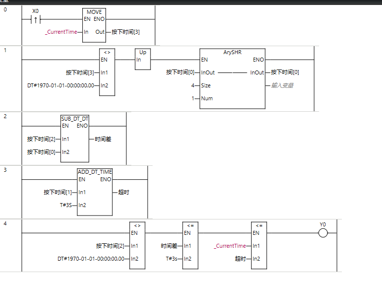 題目很簡單:任意時間段內,輸入X1,3秒內ON三次,輸出Y1 ON。