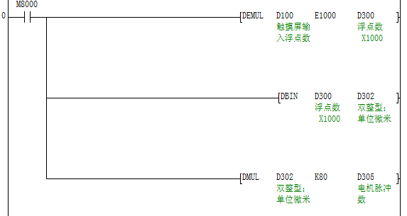 如你說的“現在計算出來是電機正向走80000脈沖,我設備移動1MM”,那么0.01mm發800個脈沖嗎,12.23mm就是發送1223*800個脈沖。在觸摸屏不要選擇浮點數,一般選擇整數帶小數數點的,觸摸屏上小數在plc寄存器是不表現出來,觸摸屏12.23在plc寄存器中就是1223。