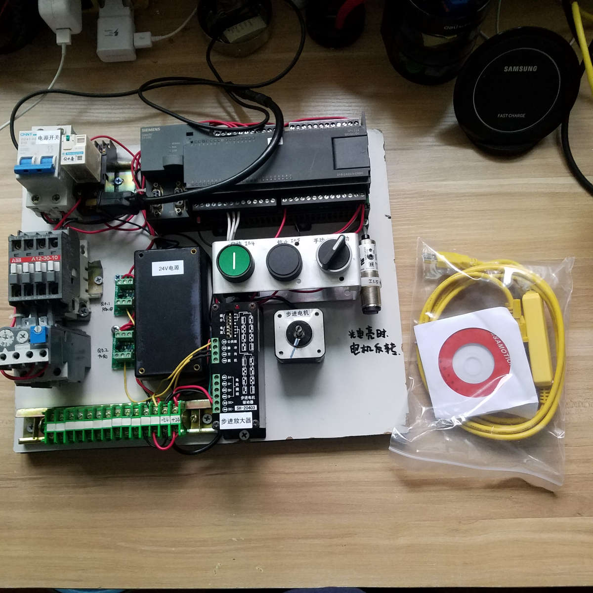 這一套含:原裝德國進口西門子CPU226的PLC,和利時步進電機一套,施耐德中間繼電器一套,ABB接觸器熱繼電器一套,正泰空開一個,施耐德按鈕旋鈕一套,日本進口光電一個。這套學習機做的非常好,有初級開始認識按鈕開關的接線,有繼電器線路的接線,有電機拖動的接線,有光電開關的接線,有PLC的接線學習,步進系統的接線學習,從初級學習到高級應用,全部搞定,送全新西門子PLC編程線一根,送西門子最新編程軟件,送接線圖紙一份,送PLC控制程序。你還在等什么。僅此一套,錯過就沒有了。后期學習完還可以繼續轉讓,一點也虧不了。趕快購買吧。