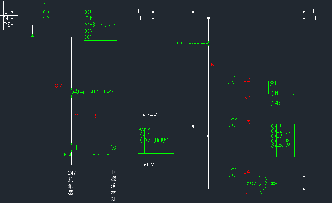 這電路有點搞。別笑,俺專業是電氣非工控。之所以這么說,是因為為何要用24V直流電來控制交流接觸器?還有KM接觸器的三副觸點竟然即控制直流24V電路還控制著220V~電路。這應該是不被允許吧?還有后面這個N端盡量別通過接觸器而應該直接通路連接。否則萬一觸點接觸不良,接觸器吸合后火線已經串進各分支電路,但因N端接觸不良沒有導通,表面看卻是沒有接通,設備帶電容易出現觸電問題。
