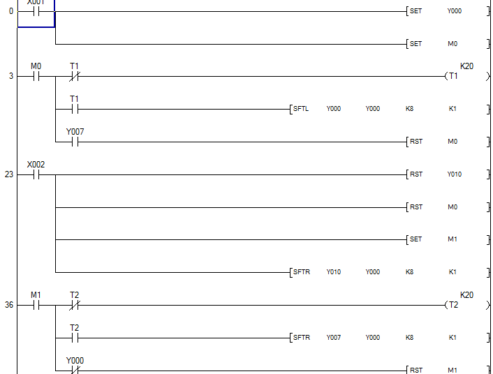 主要是反向回來瞬間,因為要一按 X2 就關閉最後運轉那一臺,因按 X2 超過 PLC 運轉一個脈衝時間,右移指令加上 SFTRP 即可。