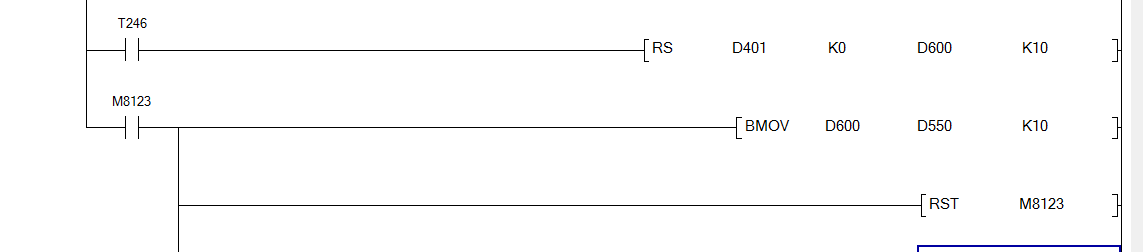 2、間隔一段時(shí)間(間隔時(shí)間與通信速率有關(guān),如9600,表示每秒發(fā)送1200個(gè)字節(jié),間隔3.5個(gè)字符,約3ms左右,可適當(dāng)調(diào)節(jié)。如果間隔時(shí)間太短,就降低通信速率)后,使某個(gè)位元件置1(如M11),執(zhí)行接收數(shù)據(jù)的RS指令,然后用邊沿脈沖使M8122置1,開(kāi)始接收數(shù)據(jù),收到回復(fù)后M8123置1,需要同時(shí)對(duì)M11和M8123復(fù)位。