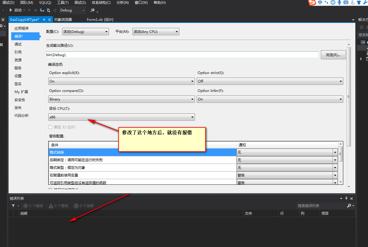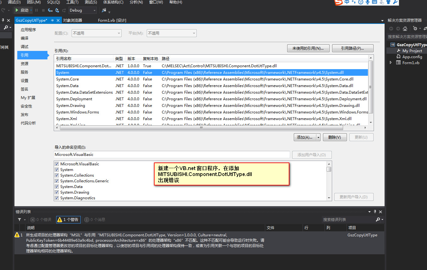 警告 1 所生成項(xiàng)目的處理器架構(gòu)“MSIL”與引用“MITSUBISHI.Component.DotUtlType, Version=1.0.0.0, Culture=neutral, PublicKeyToken=6b44489e63a9c4bd, processorArchitecture=x86”的處理器架構(gòu)“x86”不匹配。這種不匹配可能會(huì)導(dǎo)致運(yùn)行時(shí)失敗。請(qǐng)考慮通過(guò)配置管理器更改您的項(xiàng)目的目標(biāo)處理器架構(gòu),以使您的項(xiàng)目與引用間的處理器架構(gòu)保持一致,或者為引用關(guān)聯(lián)一個(gè)與您的項(xiàng)目的目標(biāo)處理器架構(gòu)相符的處理器架構(gòu)。 GszCopyUtlType