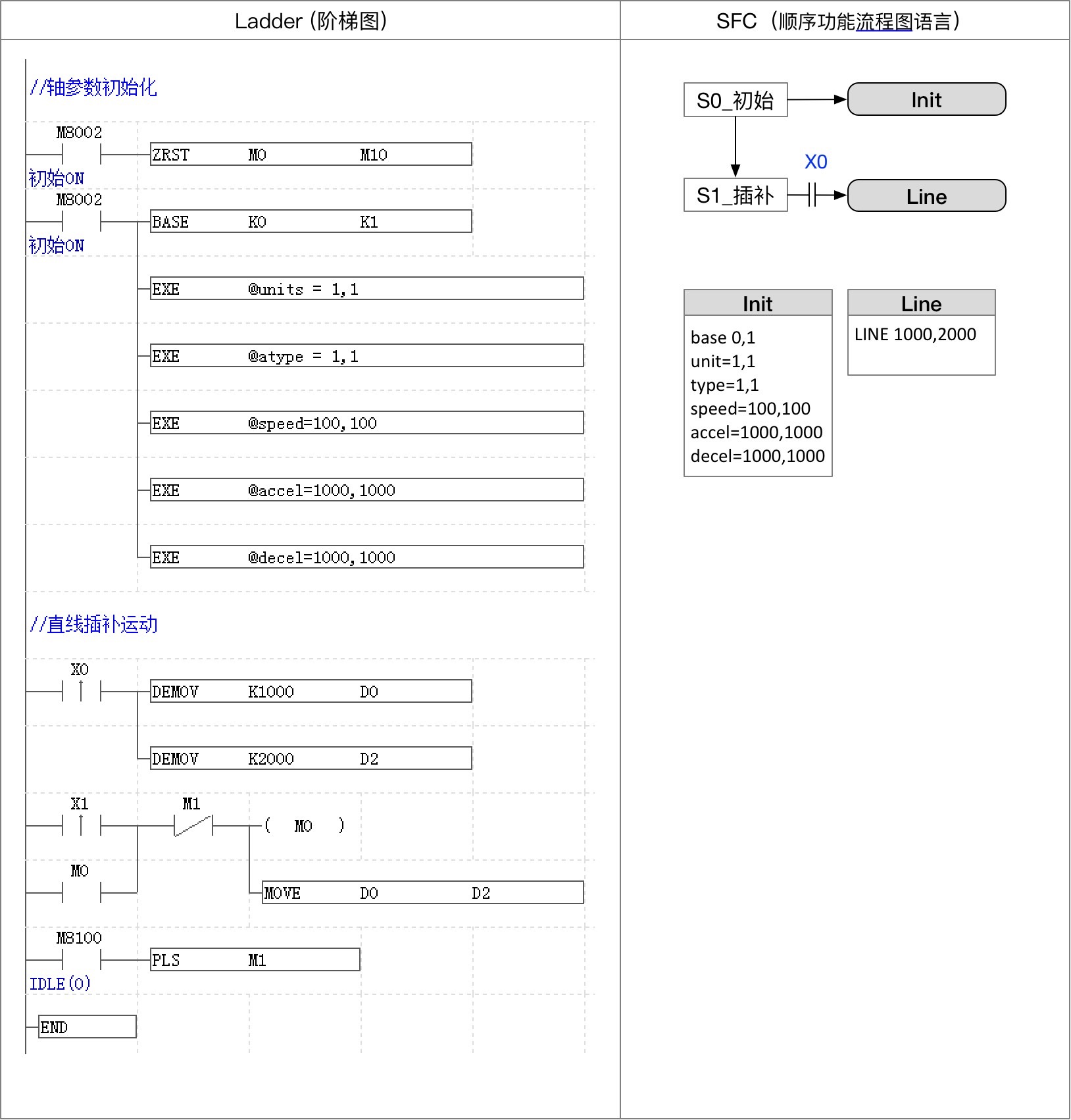 下面以2種語言實現兩軸直線插補運動為例(相同動作), 讓大家有個參考。