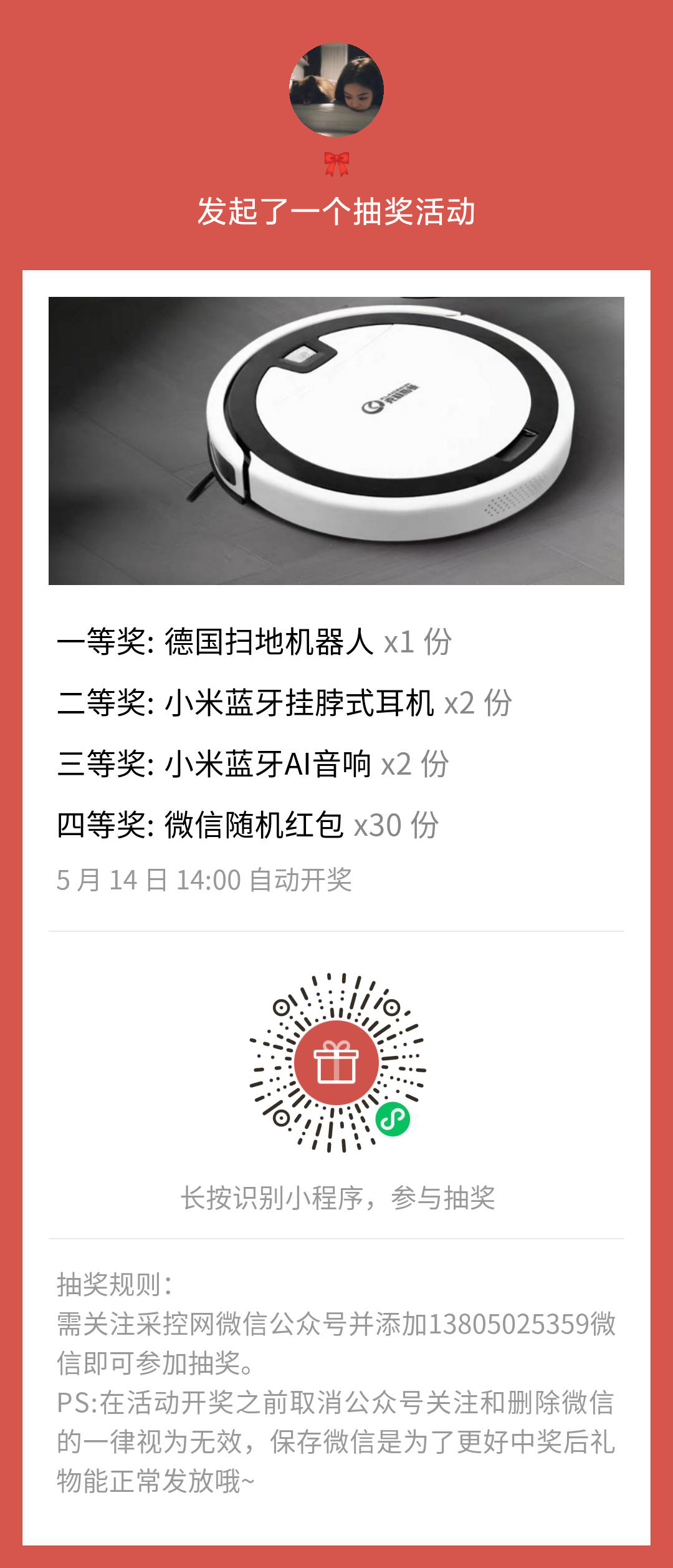 來抽個獎提前祝大家五一快樂(保存圖片到手機,長按識別小程序即可參加抽獎)