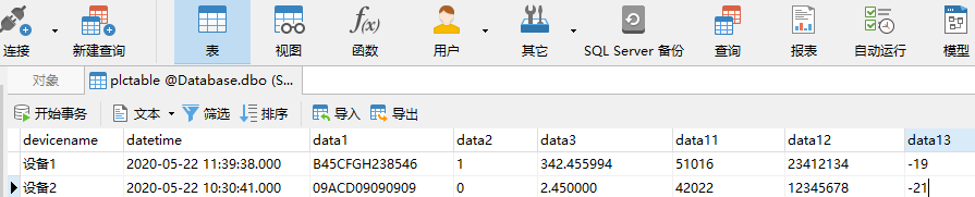 本案例所連接數據庫名稱:Database ,服務器的IP和端口是:192.168.1.222:1433  ,數據表名稱:plctable ,表結構如下: