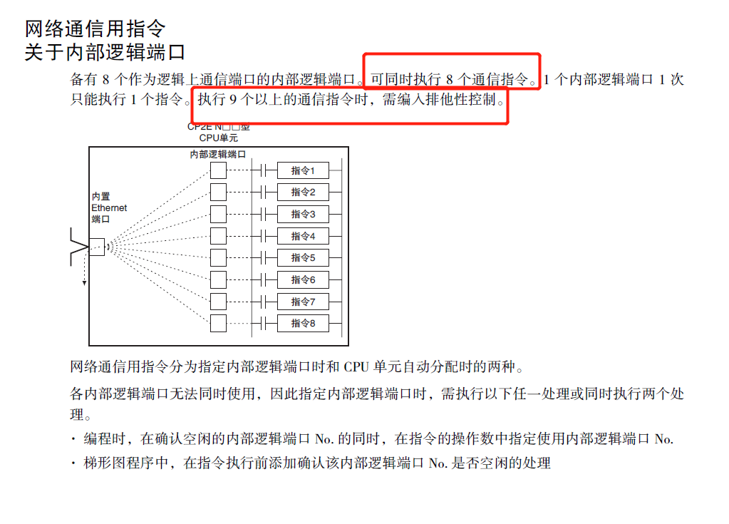 CP2E-N手冊說FINS通信中RECV和SEND指令可以同時使用8個指令,PLC備有8 個作為邏輯上通信端口的內(nèi)部邏輯端口。可同時執(zhí)行8 個通信指令。但是實際使用時有問題