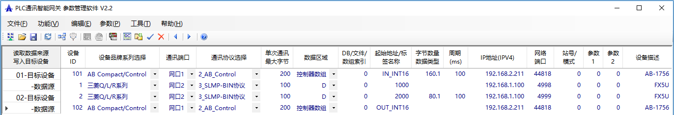 首先打開參數設置軟件(在附件中)通過'功能'->'網口參數編輯'設置網關模塊自身的IP地址等網絡參數,再通過'功能'->'PLC之間通訊'進入PLC之間通訊的數據配置頁面,以下是已配置完成的羅克韋爾(AB)與三菱FX5U設備之間的通訊數據配置: