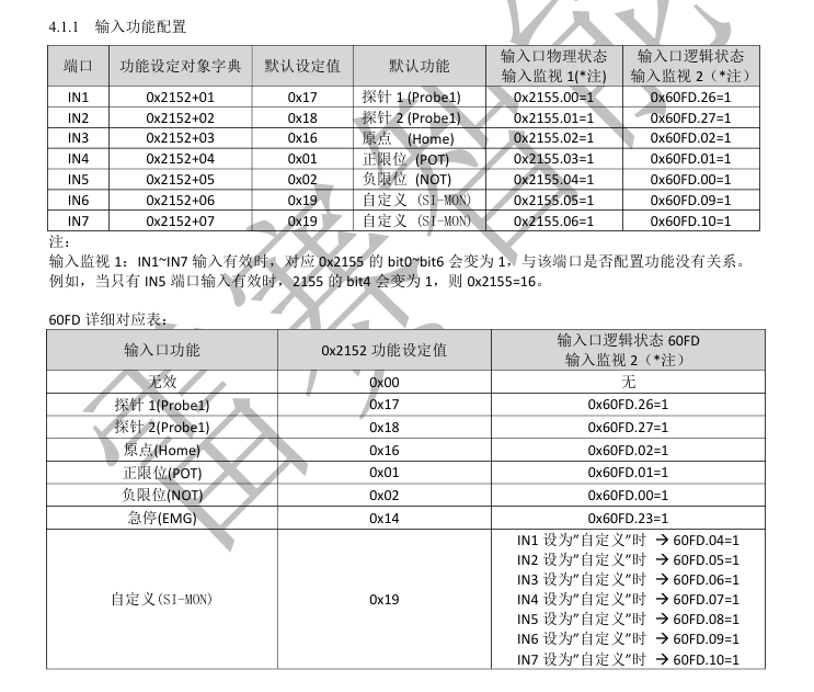 驅(qū)動(dòng)器引腳接線 需要按照驅(qū)動(dòng)器說明書來進(jìn)行確定 例如:引腳1 ---- 正限位 對(duì)應(yīng)的映射地址為 60FDh-00.1