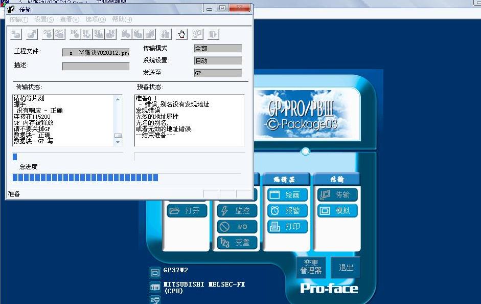 我有一個PROFACE GP37W2-BG41-24V 的觸摸屏,從另外一個屏上下載的程序,傳送到另外一個屏的,傳輸的時候在準備一欄中就會出現 無法找到地址或者地址錯誤 的 提示,傳輸完成以后,屏幕上顯示 傳輸數據錯誤 ,有部分畫面不會出現。可是我打開以前備份的別的機臺的程序傳上去卻沒有問題。懷疑是程序問題,另外一個機臺下載的程序,仍然是這樣的,是同樣的一個公司的機臺。是不是觸摸屏加什么設置了無法上傳完整的程序呢?