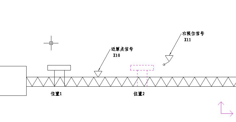 機(jī)械位置如圖所示,無論滑塊是在圖中的位置1還是位置2,均讓伺服電機(jī)正轉(zhuǎn)向右行走,直到接觸到右限位開關(guān),(此處也可以用相對定位指令,無論在何處均發(fā)一固定數(shù)目的脈沖向右行走,保證能走到近點(diǎn)開關(guān)的右側(cè)),延時0.5秒后啟動原點(diǎn)回歸指令,中斷允許,以600R/分的速度向左行走,到達(dá)近點(diǎn)開關(guān)后以60轉(zhuǎn)/分的寸動速度行走(擋板的長度超過絲杠的最小螺距,保證在X10為OFF前找到Z信號)。