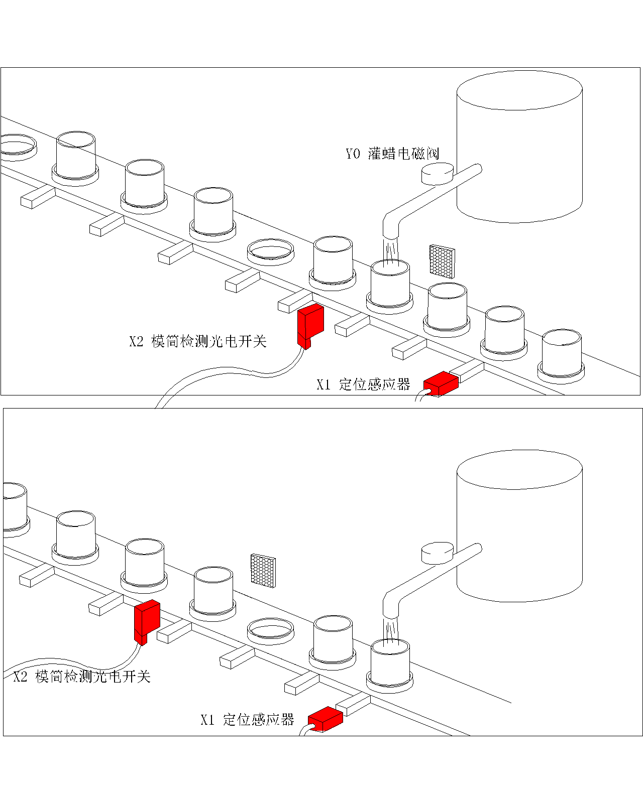 下圖是把檢測產品的感應器放在前面,先檢測然后等到了灌的地方,開始灌