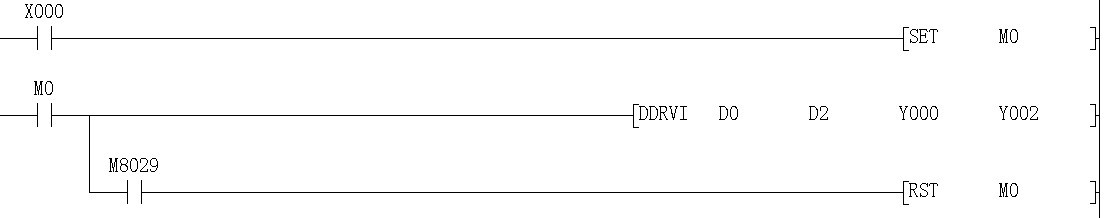 DDRVI D0 D2 Y0 Y2 D0是運動量(可以是K99999或者K-99999) D2是速度 Y0 是脈沖Y2是方向 是相對運行的。 樓主留言:我的程序是DDRVI D100 D102 Y0 Y1 現在就是脈沖閥不出來? |