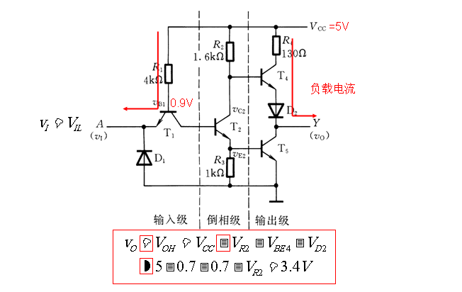 Vcc是表示電源5V電壓,V0表示地,也就是電源負極;VR2為3.4V,表示R2兩端壓降為3.4V;VBE4是指T4三極管基極與發射極的飽和導通電壓為0.7V;VD2是指二極管D2兩端的導通電壓為0.7V;V0-VH(U1)為信號電壓輸入端;V0-VOUT(UO)為信號輸出端。此電路當倒相極T2導通后,T4及T5導通后,對輸出負載Y進行鉗位,使輸出為低電平,負載電流取決于R4的阻值大小。