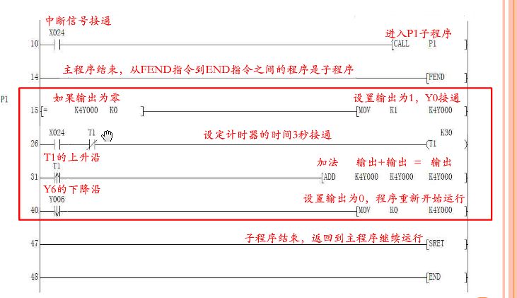 看懂你的意思了,這你使用X24接通去調(diào)用子程序P1 ,你想用中斷去調(diào)用子程序的話,有幾種方式,一個(gè)是外部中斷,一種是內(nèi)部時(shí)鐘定時(shí)中斷,還有高速計(jì)數(shù)器中斷,外部中斷和條件接通去掉子程序差不多,但是內(nèi)部定時(shí)器中斷的是不受掃描周期的影響,達(dá)到定時(shí)的時(shí)間后就去執(zhí)行中斷程,高速計(jì)數(shù)器中斷器達(dá)到計(jì)數(shù)個(gè)數(shù)后產(chǎn)生中斷。一般在三菱中外部中斷I000,I001分別表示下降沿和上升沿接通。I6** 中** 就表示中斷的時(shí)鐘。關(guān)于中斷指令的詳細(xì)資料可以參照變成手冊(cè)啊,自己看了就懂了。 工控交流群QQ314713368
