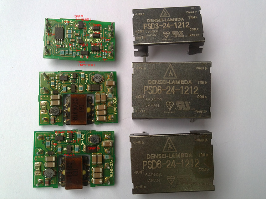 這個模塊價格比較貴,淘寶價100-130元/個,看來只能維修了,焊下PSD6-24-1212,單獨通電模塊,發(fā)現(xiàn)輸出電壓35V,電壓太高!馬上斷電,用手摸輸出+12V的整流二極管、電感、回路上的一個采樣電阻均有燙手,那個電阻,還有點發(fā)黑!拆下測量幾十K變化不定,確認已損壞(封裝是0402,這種封裝的電阻體積太小,都不標(biāo)上阻值,),再測量電路上的所有電阻,另一個0402封裝的電阻阻值無窮大、損壞,這個電阻位于一處硅膠密封的地方(因散熱不良,長期工作后引起損壞),由于上述2個電阻都不清楚阻值,試把PSD3-24-1212也一并拆下,發(fā)現(xiàn)電路原理和PSD6-24-1212差不多,這2個電阻分別是560歐、390歐,后來在一次測量中,燒壞了的那個電阻竟然自動恢復(fù)了!測量1.000K,相當(dāng)標(biāo)準。試更換1K、390歐2個電阻,通電,測量輸出+12、-12V正常,原來燙手的那幾個元件也不熱,把模塊焊回電路板,通電測試,一切正常,故障排除。