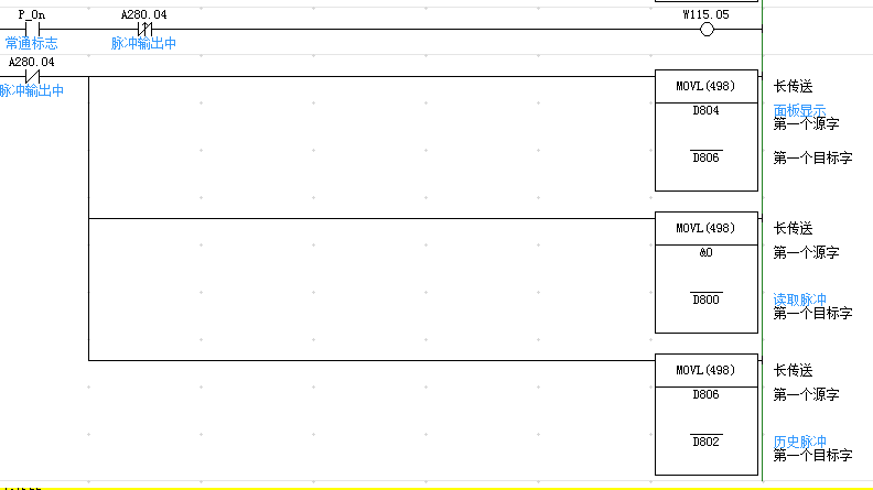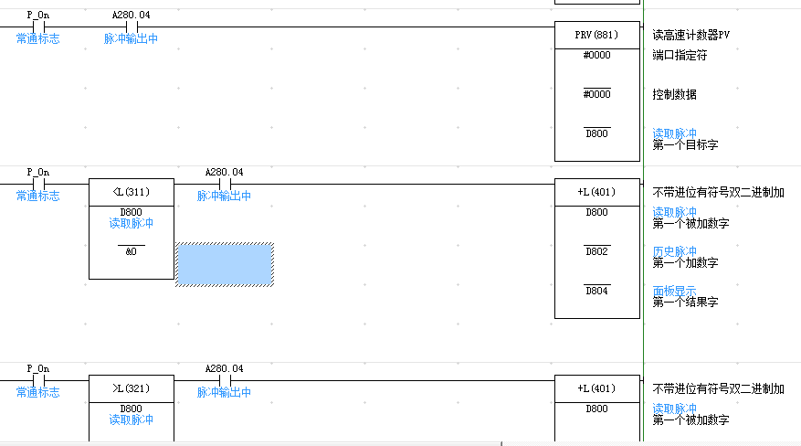 我在做一個帶手搖輪的伺服系統,編碼器壞了,要用高速脈沖算出當前行走的位置,我的思路是讀出脈沖輸出當前值d800,加上歷史脈沖d802,送到面板顯示d804里,當這次脈沖輸出完成時把d804,送到歷史脈沖d802里,,,,,這個在手動時是準確的,可是在手搖是會出現這種哦個現象,假設當前坐標100,我往正方向搖走到109時,會跳回到107,,,,,,手搖是用高速計數器100ms中斷計算一次差值,用pls2指令發出(不帶@)。