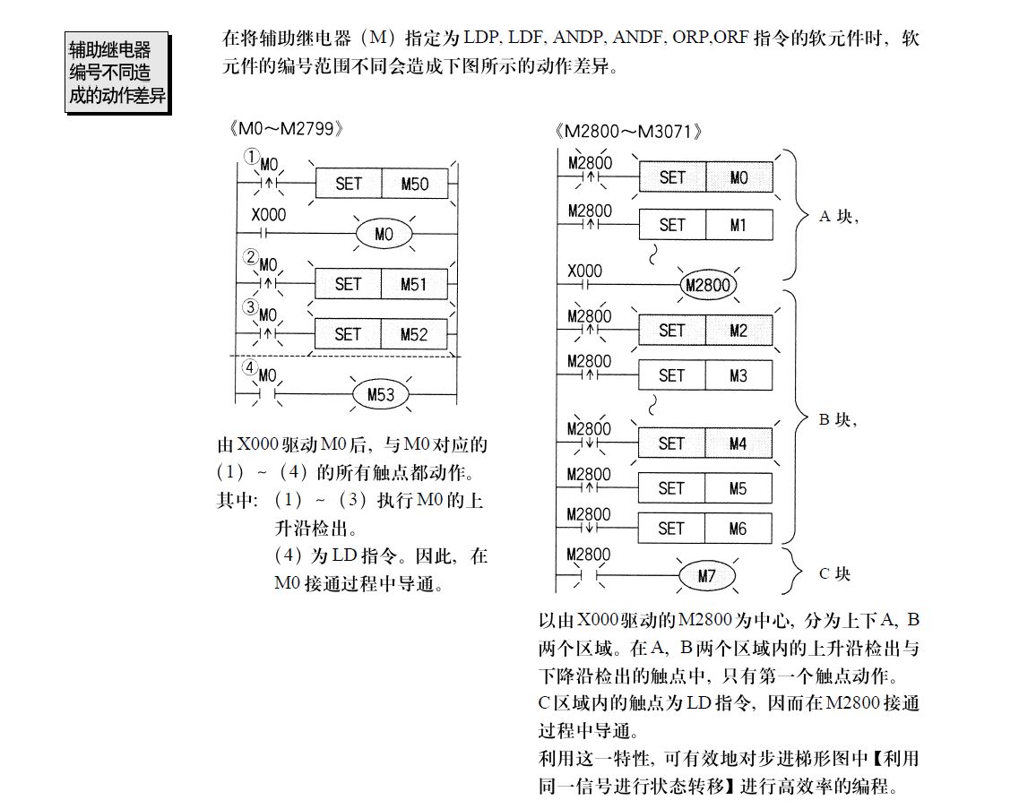 圖中的M2800-M3071為什么會(huì)只執(zhí)行第一個(gè)觸點(diǎn)呢,“利用這一特性,可有效的對步進(jìn)梯形圖中(利用同一信號(hào)進(jìn)行狀態(tài)轉(zhuǎn)移)進(jìn)行高效率的編程”這句話說的有什么實(shí)際的應(yīng)用場合么?