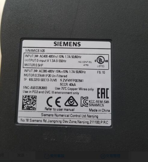 如圖所示,西門子V20的變頻器,0.37KW的,電源2個接線柱。但是銘牌側顯示三相380進線,結果接380V,冒煙了。暈,怎么回事呢,難不成銘牌貼錯了???