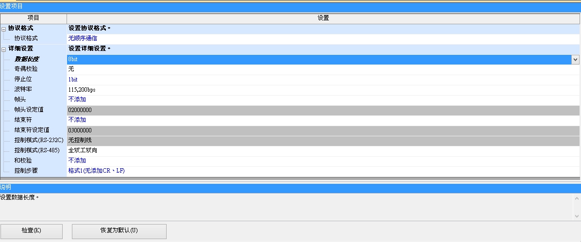 在條碼機說明書上 有寫到  使用 ASCII字符、STANDARD、115K2、8N1  的格式