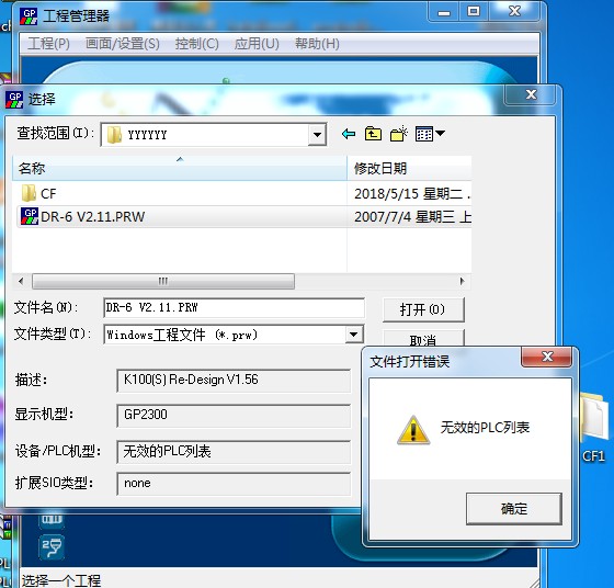 gp-pro/pb3 軟件讀寫GP2300觸摸屏。提示無效的PLC列表。可以從好的觸摸屏下載下來程序。是.PRW格式的程序。雙擊該文件,無法操作。文件后面括號里顯示無效的PLC列表。請哪位大神幫幫忙解決下吧。重謝!
