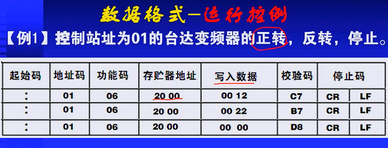 起始碼是固定的,地址碼是站號,功能碼,03是讀,06是寫。儲存器地址是指變頻器的地址,11,22,00,就是正轉,反轉,停止的代碼吧,校驗碼是算出來的,停止碼是固定不變的。