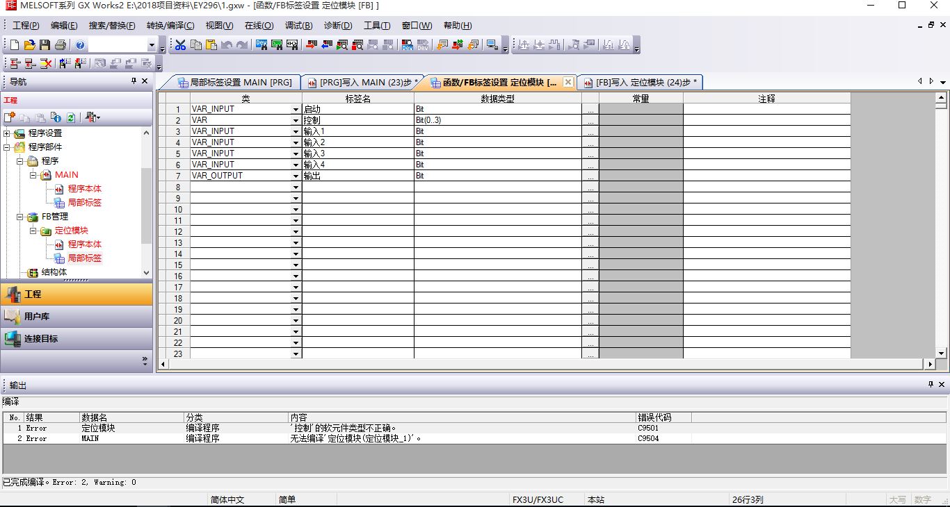 GX Works2軟件用幾年了,這段時間在研究FB功能塊編程方法,感覺蠻好用的,現在卡到一個殼了,來這里求助一下大神。我想把FX3U-1PG的參數設置做成一個功能塊,這樣在用多個定位模塊的時候,我直接拖用FB功能塊,填上相關參數就OK了,現在就卡在#25號參數,我要寫的程序是: TO K0 K25 K3M0 K1,我想把K3M0做成FB功能塊的輸入局部變量,但是做出來的功能塊用不了,提示錯誤。但是,From K0 K28 K3M20 K1,讀取狀態(tài)的K3M20做成輸出局部變量的組合位元件卻一點問題都沒有,有沒有哪位大神有高招解決此問題呀!