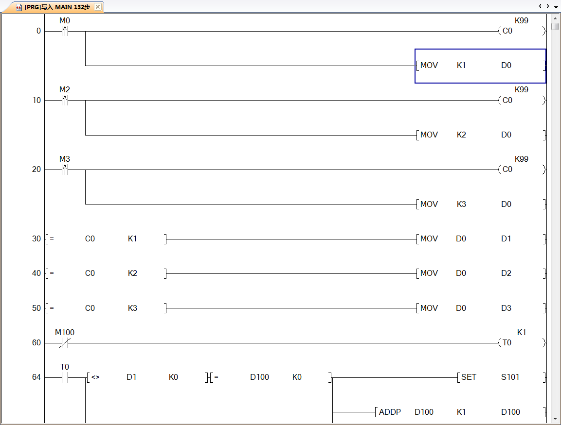 引用引用第15樓gk1234于2020-04-27 16:22發表的 :利用雙循環和間接尋址,fx3g為例,1,設定使用d501-d521寄存器,2,雙循環輸出,先設定z1和z2為1,輸出計數器c0清零,通過外循環索引寄存器z1(1-20),輸出計數設定值為z1,再通過內循環索引寄存器z2(1-20),當d500z2為1時輸出,計數器c0+1,當計數值和輸出計數設定值z1相等時,設定z2為1,完成1個小周期,接著計數器c0清零,z1+1,執行下一個小周期,3,等到內循環到d521時,設定z1和z2為1,計數器c0清零,完成個大周期。