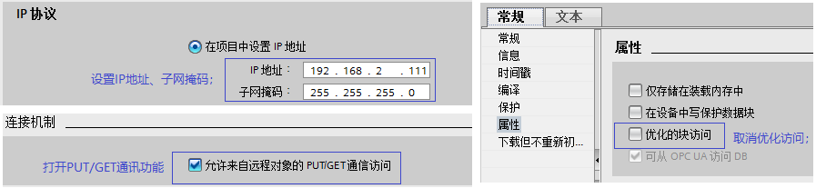 西門子的PLC需要設(shè)置IP地址,打開通訊功能,DB數(shù)據(jù)塊要取消優(yōu)化訪問,設(shè)置如下: