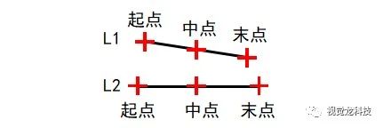 計算直線L1中起點、中點、末點到直線L2起點、中點、末點的距離。