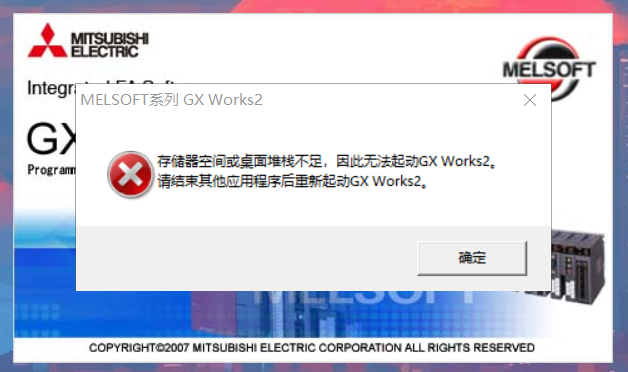 三菱GX Work2卸載后重裝,打開軟件會提示內存不足等故障,顯示儲存器空間不足的故障,