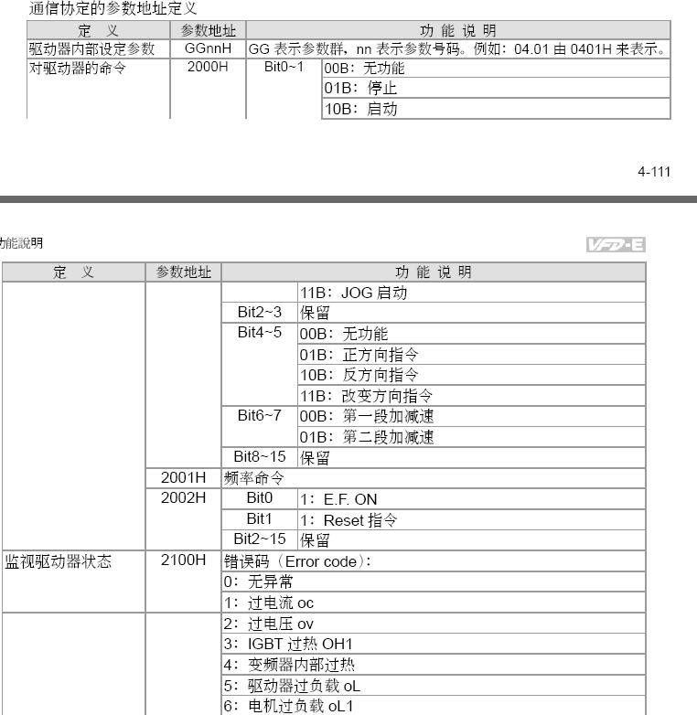 看臺達VFD-E說明書,關于RS485通訊方面的,有些地方不明白,見下圖:
