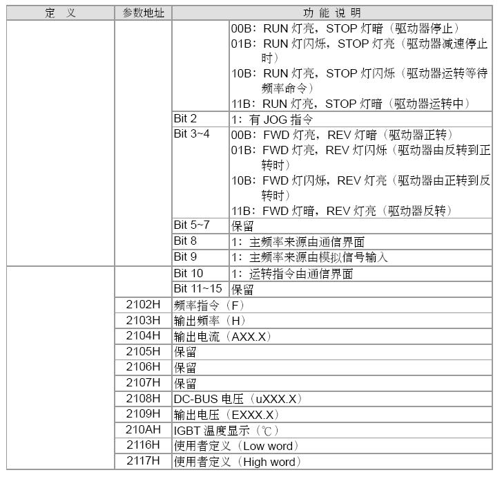 暈二:2001H(頻率命令),2102H(頻率指令(F)),2103H(輸出頻率(H)),現在只知道寫頻率時用的地址是2001H,讀頻率不知道用哪個?