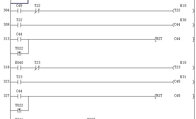 因?yàn)槌绦蚴亲陨隙聮呙璧模?dāng)程序掃描到327步的時(shí)候,C44已經(jīng)復(fù)位(已經(jīng)OFF),所以C45不能復(fù)位